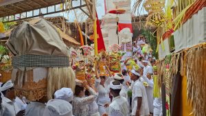 Sejak pagi, krama desa berdatangan dengan busana adat terbaik. Di tengah keramaian, suara gamelan berpadu dengan kidung suci, menghadirkan getaran spiritual yang seolah merangkul setiap hati.
